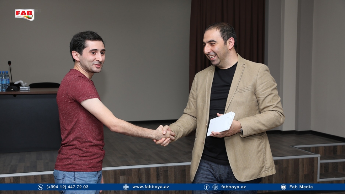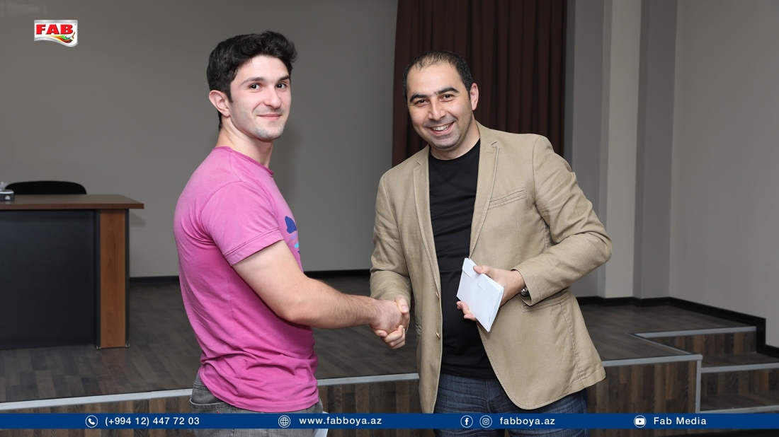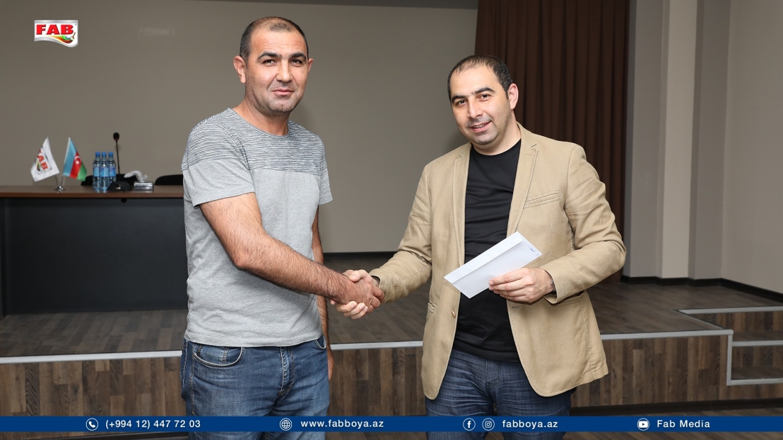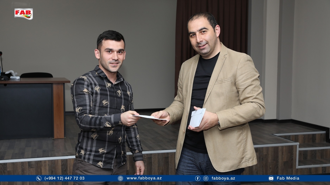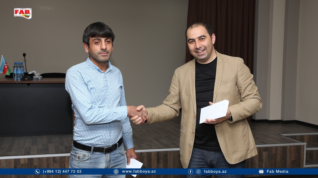 08.08.2019- cu il tarixində “GİLAN KUBOKU 2019”da uğurlu çıxışlarına görə FAB futbol komandasının üzvləri "FAB Boya və Kimya Sənayesi" MMC-nin təsisçisi Anar Əliyev və şirkətimizin direktoru Kənan Məhərrəmov tərəfindən mükafatlandırıldılar.